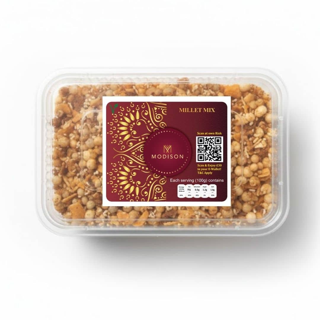 MODISON MILLET MIX | Authentic Indian Snack | Vegetarian | Exported from India | UK ApprovedPremium quality MILLET MIX from MODISON – India’s trusted exporter.100% Vegetarian, made with traditional Indian ingredients.Sealed packaging to preserve freshness during export.Imported & distributed in the UK by PRS Imports Ltd, Leicester.Long shelf life | Store in a cool, dry place | Allergen info on pack.